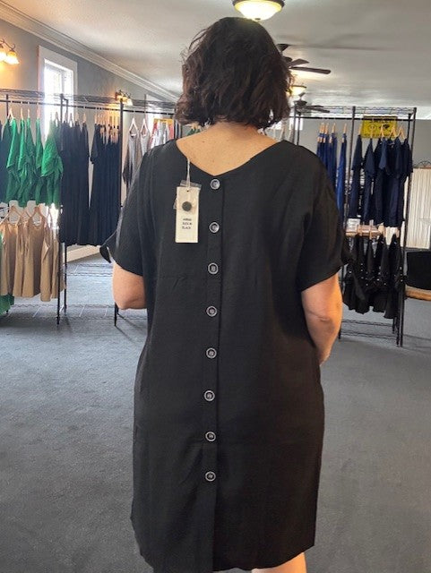 Discover the ultimate in versatile elegance with this ingeniously designed black dress. Wear it one way with a streamlined front and button-adorned back, then flip it for a statement button front paired with a serene back panel. Crafted in textured crinkle fabric that celebrates its intentional wrinkles, this piece drapes beautifully while maintaining its refined aesthetic. Cut to just at the knee and thoughtfully detailed with functional pockets, it's the sophisticated staple that works twice as hard for your wardrobe.